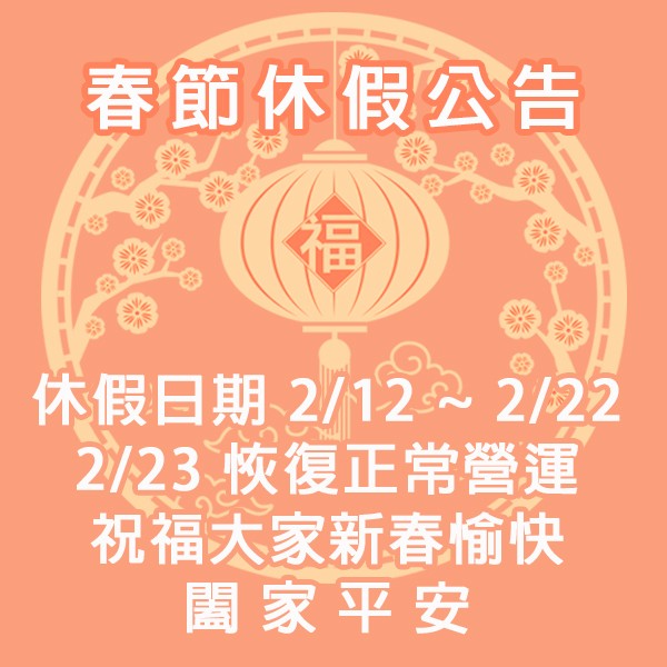 春節休假時間為 2/12 至 2/22,並於 2/23 開工,屆時將依序安排未出貨訂單出貨。